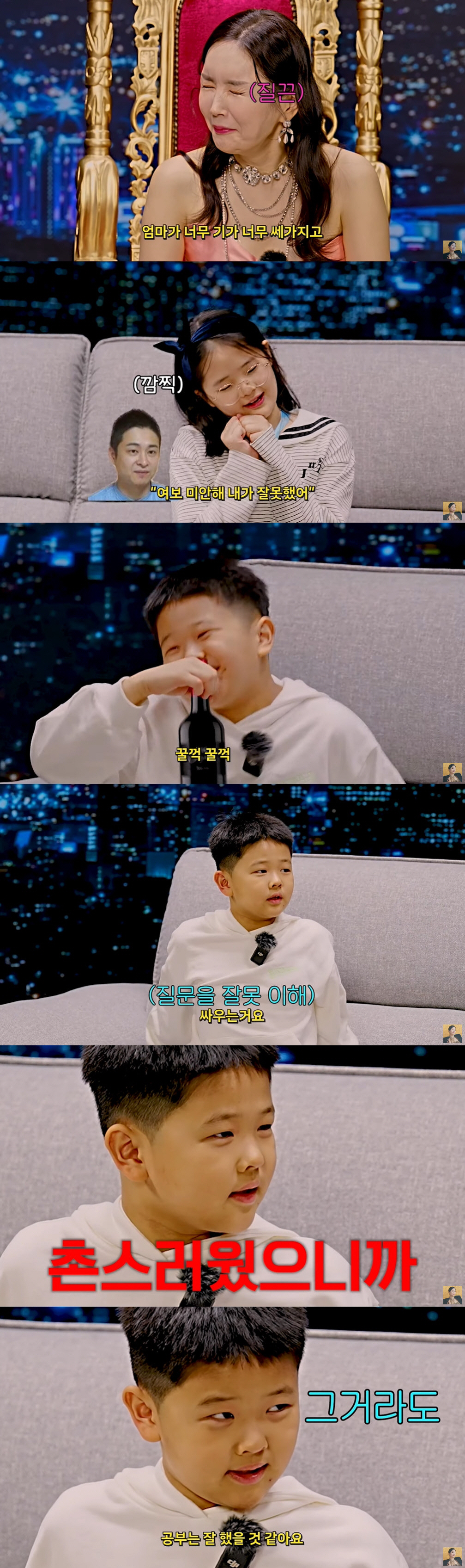 이어 지우는 "부부 싸움 후 아빠가 먼저 사과한다. 엄마는 너무 기가 세고, 아빠는 너무 마음이 여려서 '내가 잘못 했다'고 한다"고 말했다. 장영란은 딸의 폭로에 눈을 질끈 감았다. 준우는 "엄마 아빠 싸우는 모습이 보기 싫다. 싸움 후 엄마가 먼저 '여보 죄송하다'고 사과한다. 그래서 술을 같이 마신다"고 해 폭소를 자아냈다. 그러면서 준우는 '싸울 때 들었던 단어'를 묻는 질문에 "아빠가 '야 이...'라고 한다"고 했고, 장영란은 "어머 어머"라며 화들짝 놀랐다.