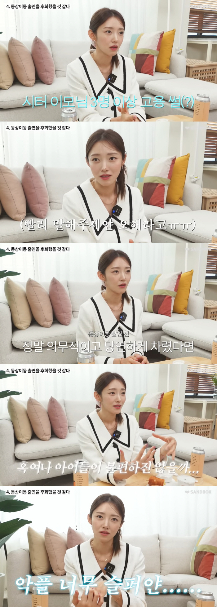 그러면서 "후회는 언제 했더라? 후회라면 집안을 다 보여주니까"라며 방송에 사적인 부분이 공개된 것에 부담감을 느꼈다고 전했고, "아이들이나 저희 엄마를 사람들이 알아보신다. 아이들 나름대로 프라이버시가 있는데 저희들 때문에 눈치를 보면서 행동하지 않을지, 그 걱정이 든다"고 전했다. 또 "가족에 대해 말이 나오긴 하더라. 악플에 너무 상처받는다. 무심코 영상을 틀면 댓글까지 쭉 보게 된다. 방송으로 표현 못한 부분이 많은데 잘못 알고 계신 분들, 콘셉트라고 생각하시는 분들도 많다. 시터 이모님이 3명 이상일 것이라는 말이 있는데 저희 집에 한 분 계신다"고 강조했다.