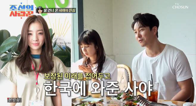 대기업에 다니던 사야는 심형탁을 믿고 한국으로 왔다. 심형탁은 "보장된 미래를 접고 와줬다. 저라면 못했을 것"이라고 했다. 김다예는 "인생을 걸었다고 표현을 해도 될 것 같다"고 했다. 사야는 "심씨만 믿고 왔다"고 했고, 김다예는 "그때는 통장잔고가 그럴 줄 몰랐을 거다"고 장난을 쳐 웃음을 자아냈다.