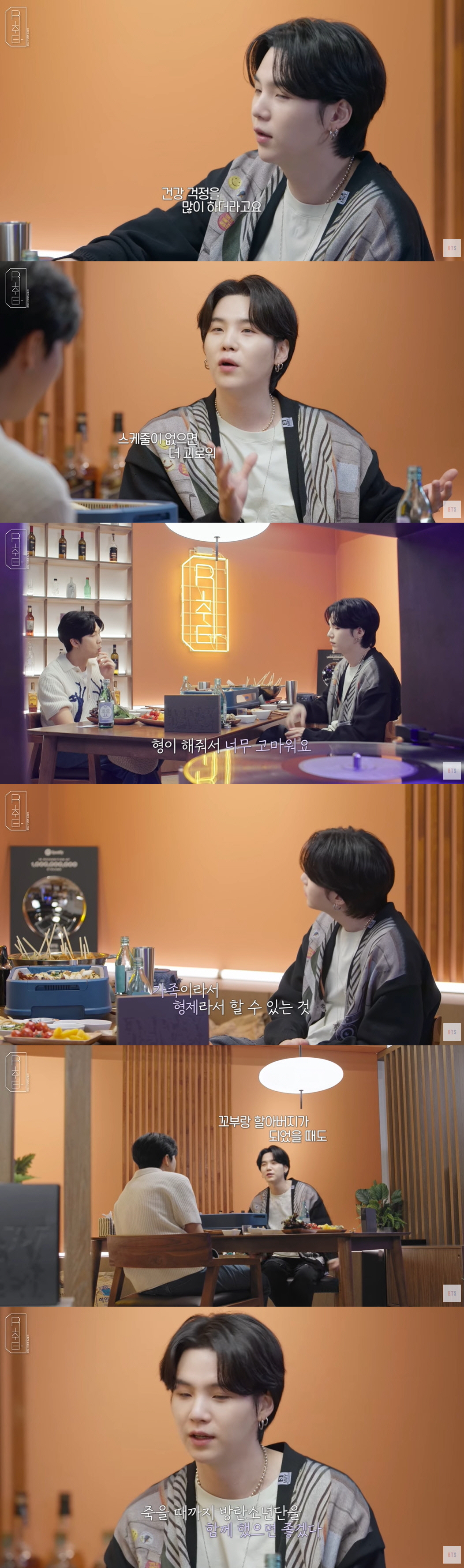 마지막으로 슈가는 'SUGA&Agust D&민윤기가 이루고 싶은 꿈'에 대해 "7명이서 죽을 때까지 함께하는 미래를 그린다"고 털어놨다. 그는 "우리 7명이 정말 오래 오래 함께할 수 있는, 가장 편하다. 오늘 편하게 이야기를 할 수 있다는 것은 가족이라서 형제라서 할 수 있는 거라고 생각을 한다"면서 "앞으로도 시간이 지나고 얼마나 더 길게 우리가 나아갈지는 모르겠지만 꼬부랑 할아버지가 되었을 때도 그때까지도 방탄소년단이 함께했으면 좋겠다는 게 꿈이다"고 했다.