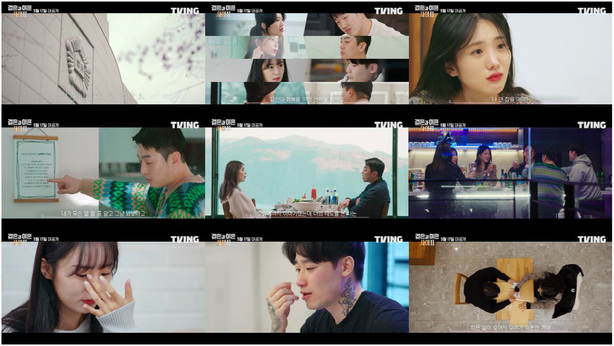 오는 5월 17일 공개를 확정 지은 티빙 오리지널 '결혼과 이혼 사이2'가 단 1분만으로도 과몰입을 불러일으키는 1차 티저를 공개했다. '결혼과 이혼 사이2'는 결혼과 이혼 사이, 선택의 갈림길에 선 네 쌍의 부부들이 '잘 헤어지는 법'을 고민하는 현재진행형 이혼 관찰 리얼리티.