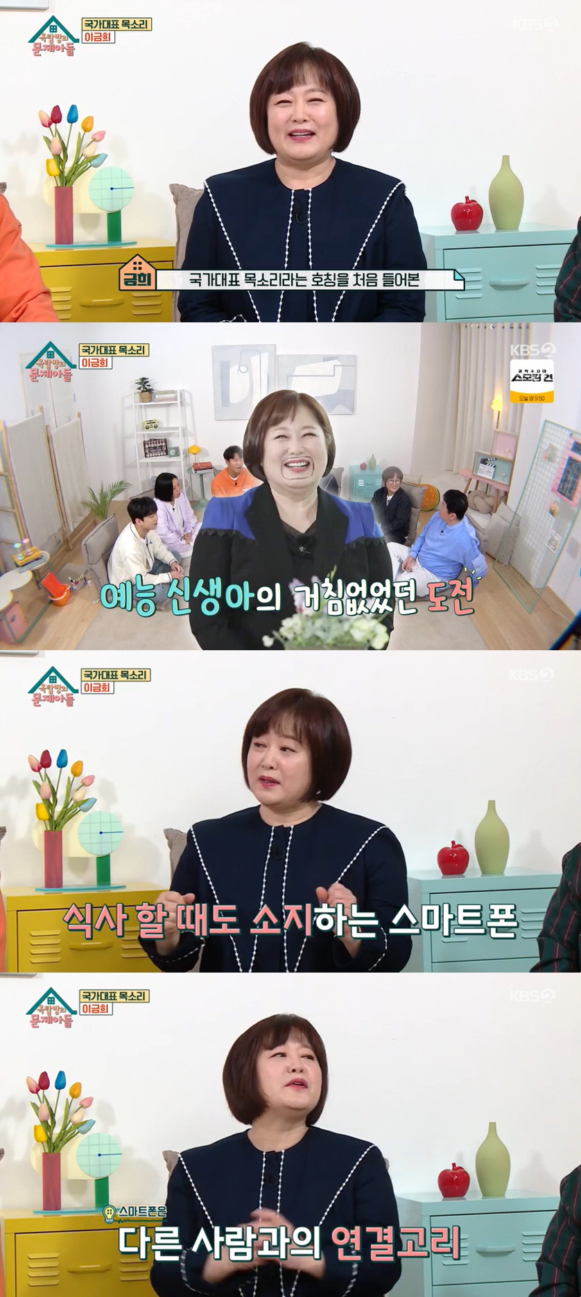 '방송에 나오는 잘못된 표현'에 대해서 이금희는 "그런 건 너무 많은데 스스로 드는 생각이 '그럴 수 있지'다. 다만 남을 공격하는 말은 좀 안했으면 좋겠다. 아이들은 여러분의 말을 따라하지 않냐"라 당부했다. 이어 "예전 '1박 2일'에서 '나만 아니면 돼'라는 유행어가 있었다. 학생들이 정말 많이 따라했다. 이기주의를 내포하고 있다"라면서도 "그 이면에는 '나 부터 살자'가 있어서 뭐라 하기도 어렵다. IMF 이후에 생긴 말이다. 돈 이야기를 하기 시작한 거다"라 했다.
