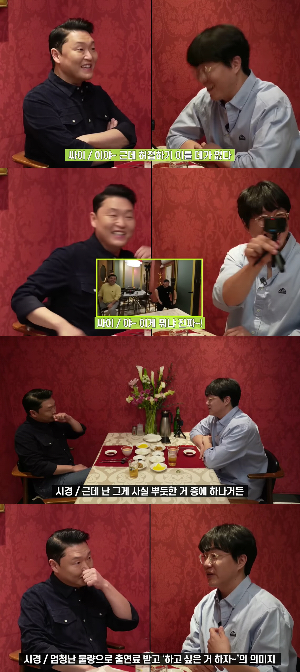 음식을 기다리며 성시경은 "(촬영 환경이) 이렇게 허술한지 몰랐지?"라며 자신과 제작진 두 명을 언급했다. 싸이는 "허접하기 이를 데 없다. 야 이게 뭐냐 진짜. 데뷔 때를 포함해 이런 환경은 처음이다"라고 말해 웃음을 안겼다. 성시경도 웃음을 터트리며 "제일 인기 없는 프로그램 스태프 수보다 훨씬 적다"라며 인정했다.