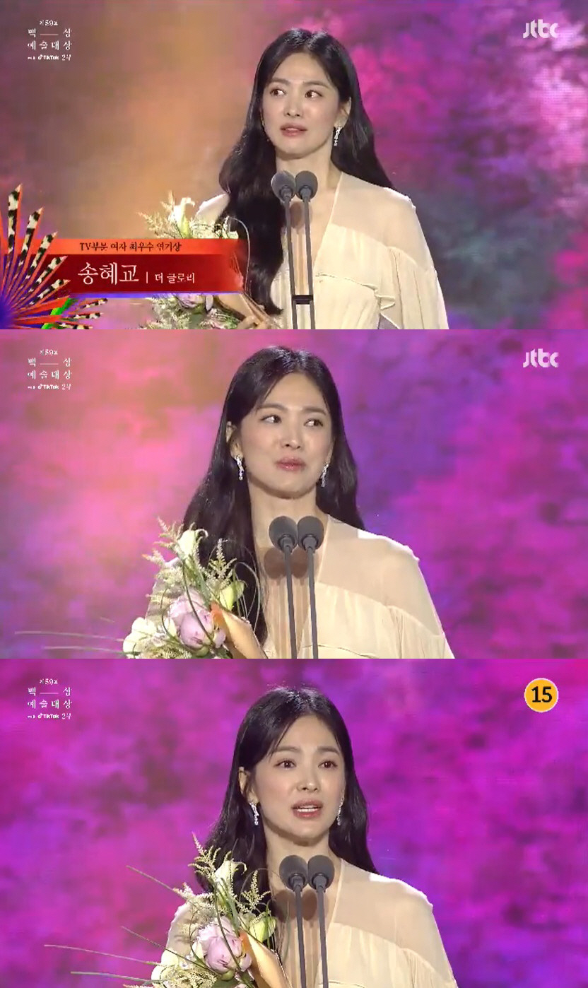 송혜교는 "김은숙 작가님과 두 작품을 했는데 다 너무 큰 사랑을 받았다. 너무 감사 드린다. 아마 김은숙 작가님이 제게 영광이지 않을까 싶다. 연기하면서 많이 힘들었고 아팠지만 더 열심히 연기하고 싶다는 마음이 생겼다. 너무 감사하다"고 밝혔다.
