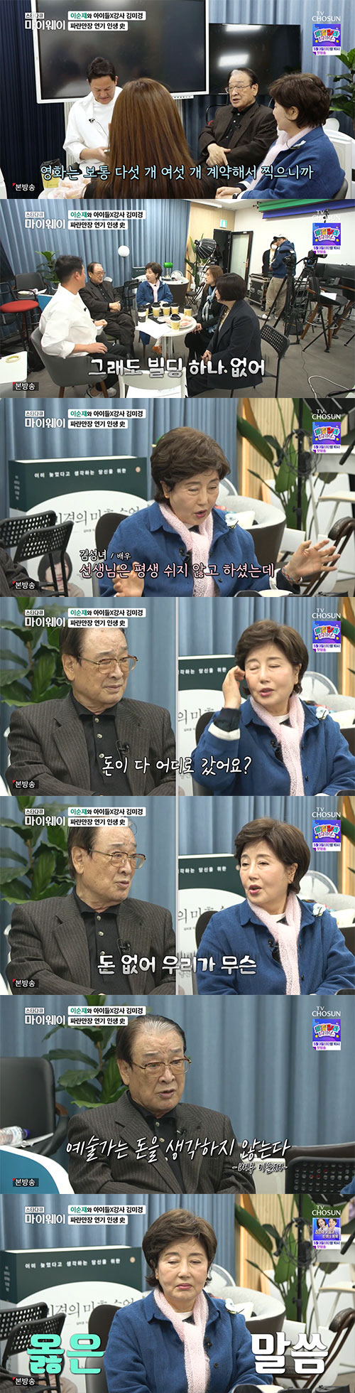 이날 이순재는 "우리 젊었을 때는 신혼 때도 집에서 자는 시간이 한달에 다섯 번도 안 됐다. 주야로 20시간씩 영화를 찍었다. 영화를 5~6개를 한꺼번에 계약했다. 하루에 영화를 4등분해서 네편을 찍기도 했다. 그래도 빌딩 하나도 없다"라고 밝혔다. 이에 김성녀는 "평생 찍으셨는데 돈이 다 어디로 갔냐"며 궁금해하자 이순재는 "우리는 돈이랑 상관 없는 사람들이다. 예술가가 무슨 돈이랑 상관 있냐. 몇 푼 짜리 받으려고 그림 그리는 화가가 어딨냐. 그냥 하는 거다. 우리는 작품이 좋으면 무료로도 할 수 있다"고 말해 감동을 안겼다.
