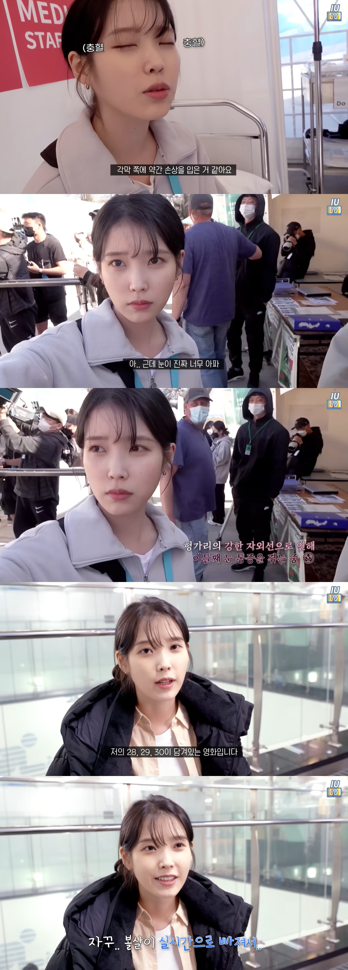 하지만 이내 "근데 진짜 눈이 너무 아프다"며 헝가리의 강한 자외선 때문에 눈 통증을 호소해 안타까움을 안겼다. 이어 "지금 컨디션은 복합적이다. 정신적인 컨디션은 좋지만 눈은 좀 아프고, 머리는 맑은데 다리가 좀 아프다. 얼굴은 좀 건조하지만 표정은 밝다"면서도 "걱정했던 것에 비해 아주 좋다"고 전했다. 아이유는 다시금 "햇빛이 너무 세서 눈이 너무 아프다. 각막 쪽에 손상을 입은 것 같다. 왜 해외에 나갈 때 선글라스를 쓰라고 하는지 알겠다"며 고충을 털어놨다.