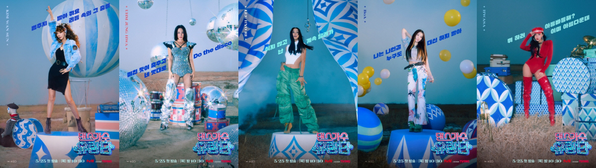 2일 공개된 tvN '댄스가수 유랑단' 5종 포스터는 김완선부터 엄정화, 이효리, 보아, 화사까지 각 아티스트들의 캐릭터를 강렬하게 담아내고 있다. 멤버들 모두 시대를 대표하는 문화 아이콘인 만큼 포스터에는 음악(가사), 패션 스타일, 헤어, 메이크업 등 디테일한 요소가 반영돼 있다.