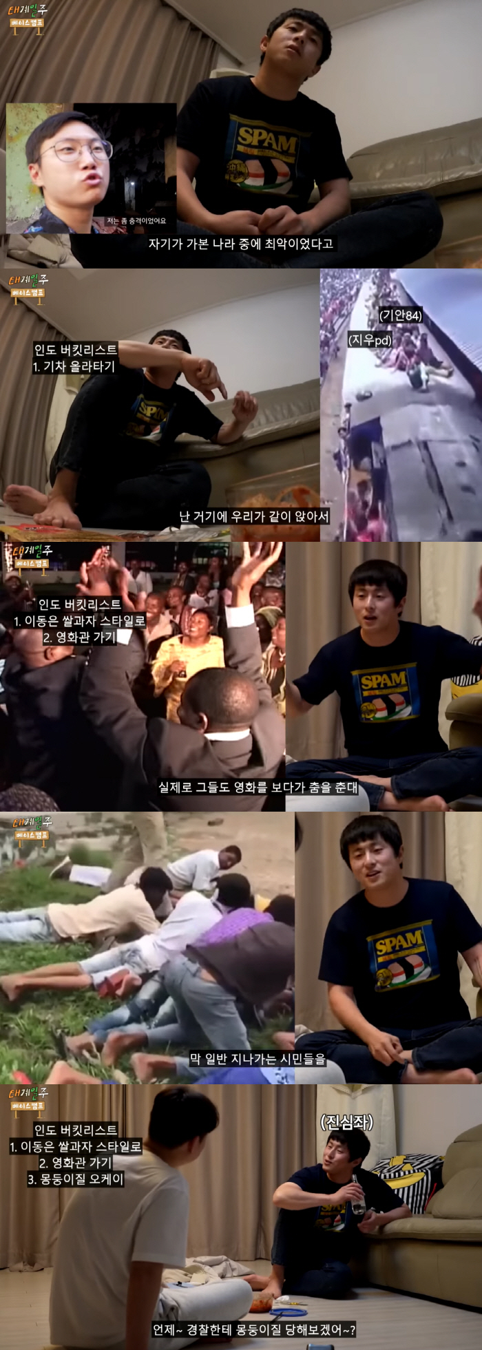 그러면서 버킷 리스트 3가지를 밝혔다. 기안84는 "그분들은 기차를 오픈카 느낌으로 기차 위에서 타신다. 같이 다 기차 위에 타서 넌 연출이니까 앞쪽에 앉았으면 좋겠다. 따닥따닥 쌀과자 생각난다. 흰색 쌀고명이 붙어있듯이..그들의 문화잖아. 나쁘다 좋다가 아니라..쌀과자 스타일로 하자"고 제안했다.