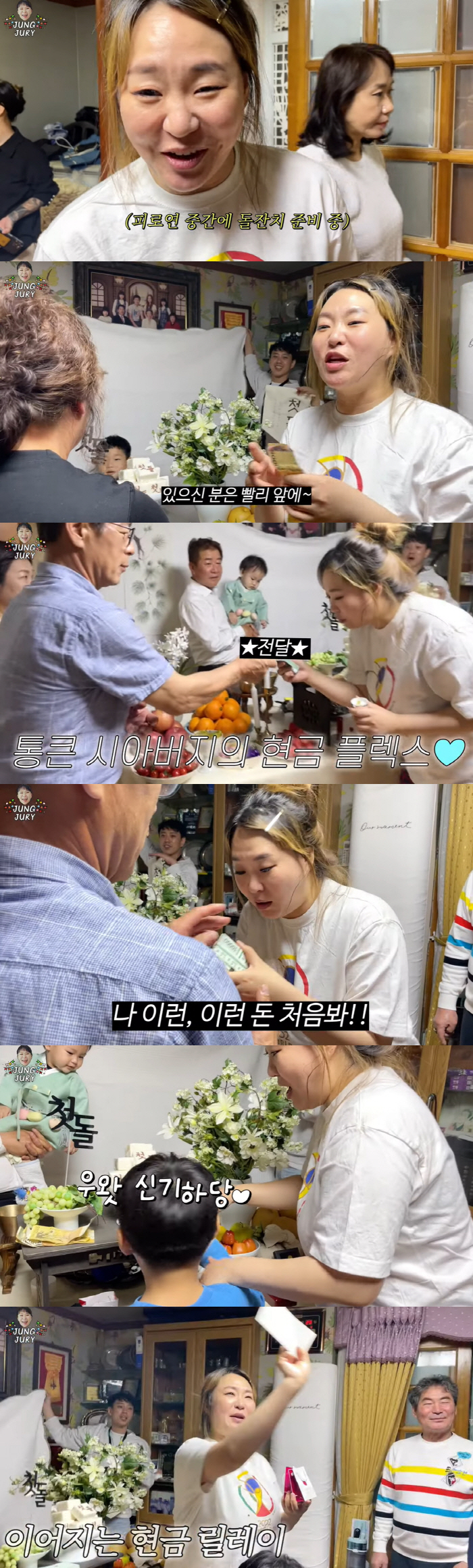 셀프 돌상을 세팅하던 정주리는 "현금이 많이 부족하다. (현금 있으신 분은 빨리 앞에 놔달라"며 너스레를 떨었다. 이에 정주리의 시아버지는 손주를 위해 빳빳한 현금 뭉치를 전달했다.