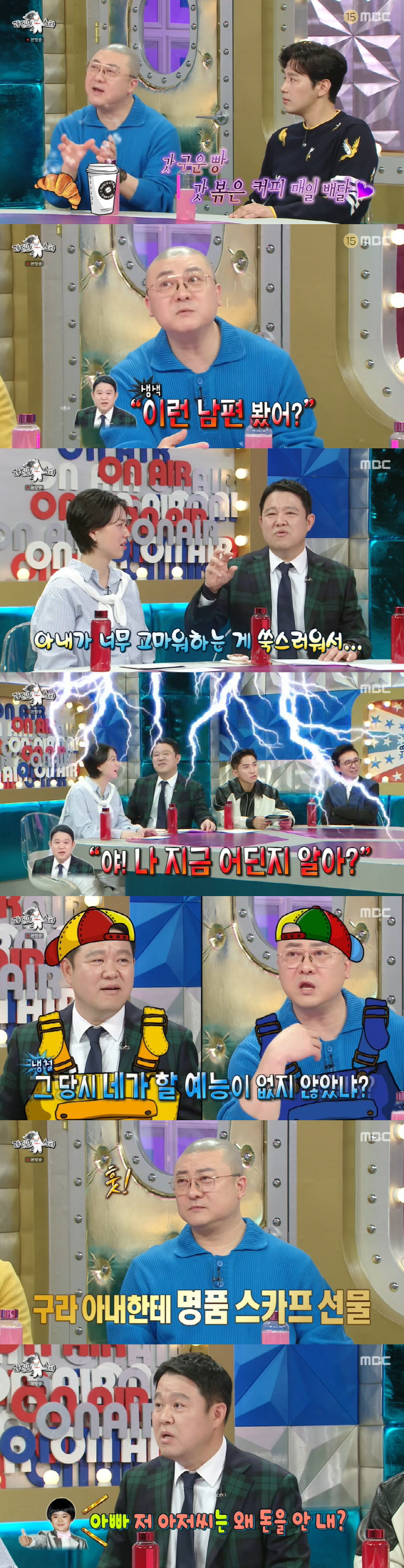 김구라는 "하여튼 염경환이 잘 돼서 좋다. 얼마 전에 우리 집에 왔을 때는 아내한테 명품 스카프도 선물했다"고 말했다. 이에 염경환은 "왜 내가 망고 사 간 이야기는 안 하냐. 백화점 망고"라고 강조했고, 김구라는 "요즘 많이 바뀌었다. 예전에는 안 그랬다. 오죽하면 옛날에 동현이가 '아빠 저 아저씨는 왜 돈을 안 내냐'고 물어봤다"고 폭로해 폭소케 했다.