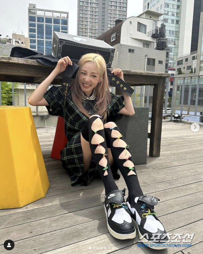 공개된 사진에서 산다라박은 GD로부터 선물 받은 운동화를 신고 다양한 포즈를 취하고 있다.