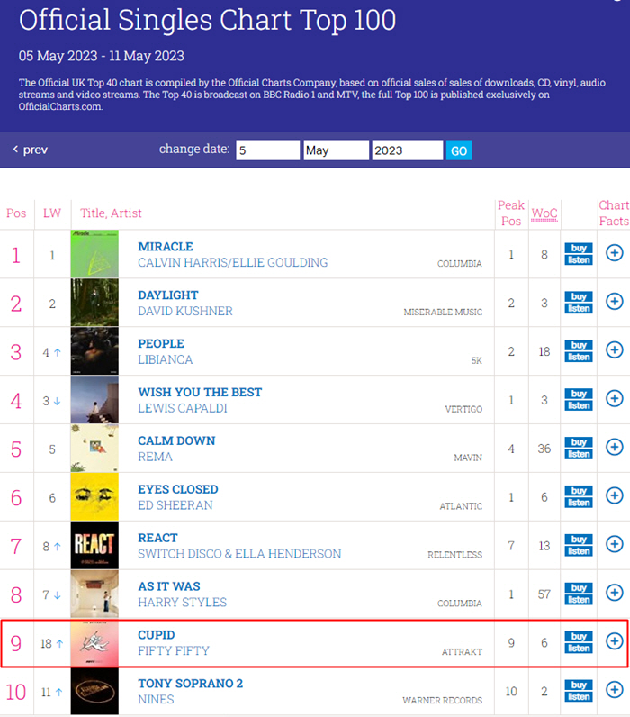 5일(현지시각) 발표된 오피셜차트에 따르면 걸그룹 FIFTY FIFTY(피프티 피프티)가 지난 2월24일 발매한 첫 번째 싱글 '더 비기닝: 큐피드(The Beginning: Cupid)'의 타이틀곡 '큐피드(Cupid)'가 이번 주 싱글 차트 톱100(5~11일)에서 9위를 차지했다. 이는 지난주 18위에서 9계단 상승, 9위에 오르며 케이팝 걸그룹으로는 최초 톱10에 진입하는 새로운 기록을 세웠다.