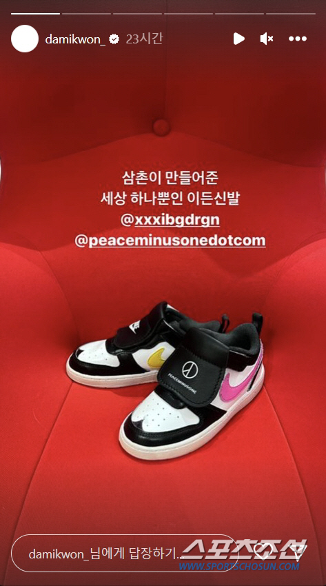 또 지드래곤이 자신이 협업한 브랜드에서 나온 디자인과 똑같은, 조카를 위해 특별 제작한 운동화 사진이 눈길을 끈다.