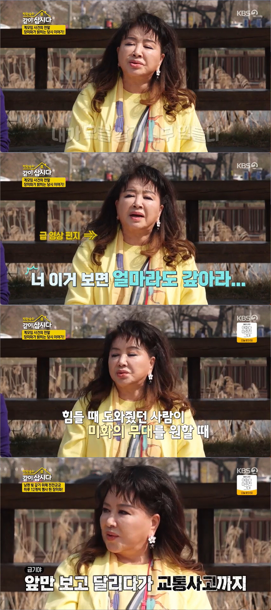 그 시대 때 9500만 원이면 지금으로 치면 도대체 얼마냐"라 놀라워 했고 혜은이는 "돈도 크지만 사람에 대한 배신감이 컸다. 도망간 계주를 언니가 너무 예뻐했다. 언니는 그 계주의 은인이었는데"라 했다.