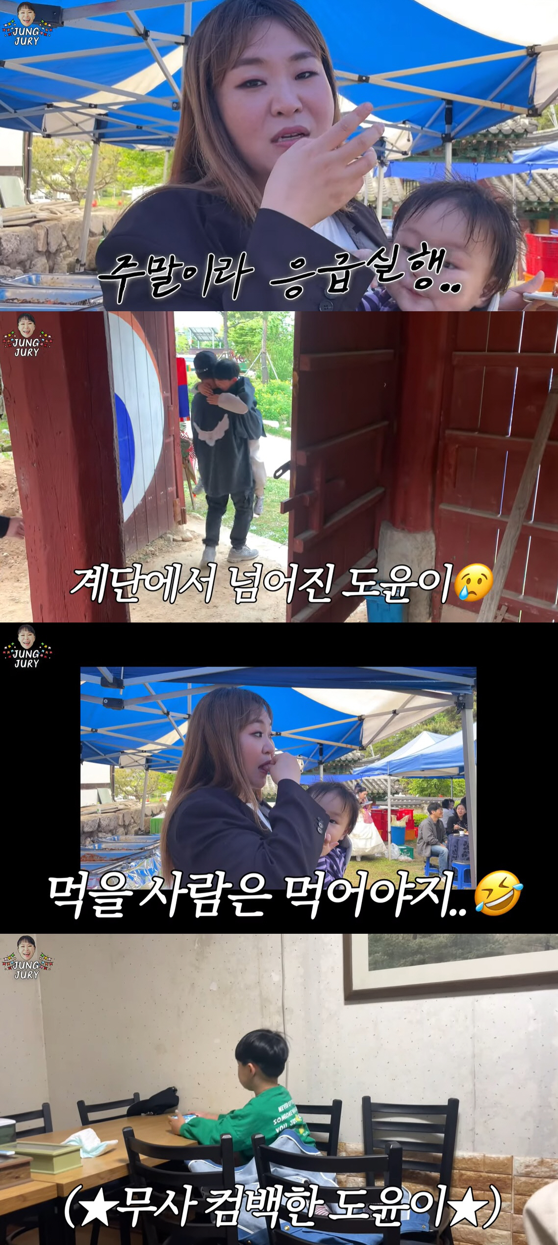 정주리가 막내 도경이의 밥을 먹일 때 어딘가에서 엉엉 우는 소리가 들렸다. 첫째 도윤이가 계단에서 넘어져 다친 것. 이후 정주리는 "우리 첫째가 다쳐 남편이 응급실에 데리고 갔다"고 설명했다. 다행히 큰 이상은 없었다고. 정주리는 "남편과 도윤이 둘 다 밥을 못 먹고 있다"는 걱정을 하면서도 먹방을 멈추지 않았다. 이를 본 정주리 지인은 "언니 너무 잘 먹는 거 아니야?"라고 반응해 웃음을 안겼다.