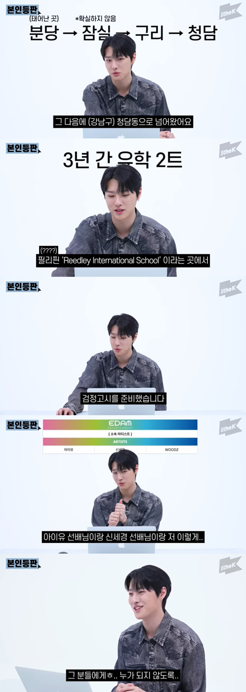 우즈의 학력을 본 제작진은 "제가 본인등판하면서 본 학력 중에 제일 길다"고 놀랐다. 이에 우즈는 "제가 어렸을 때 이사를 많이 다녔다. 분당에서 태어나고 잠실에서 살다 구리시로 이사 가고 청담동으로 넘어갔다. 그리고 제가 브라질에서 축구를 배우러 유학을 하다 가수가 되러 한국에 온다"며 "부모님을 설득했는데 부모님이 영어 공부라도 해라 해서 필리핀에서 학교를 다니다 방학 때마다 한국에서 봤던 오디션에 붙어서 한국에서 지내게 됐다. 아이돌 연습을 하며 검정고시를 준비했다"고 밝혔다.