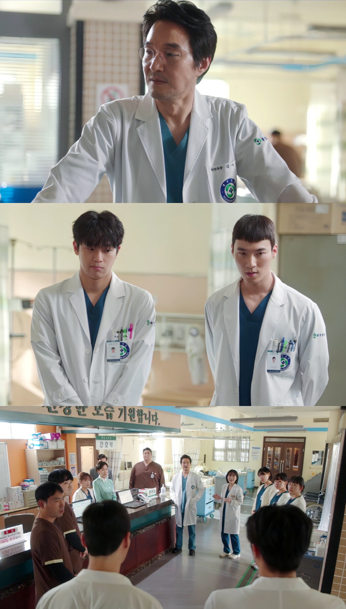 이런 가운데 공개된 5회 장면은 돌담병원 응급실에 남은 김사부와 수간호사 오명심(진경), EM전문의 윤아름(소주연) 등 의료진들의 모습이 담겨 있어 눈길을 끈다. 그들의 불안한 시선 끝에는 신입 GS전공의 3년차 장동화(이신영), CS펠로우 1년차 이선웅(이홍내)이 있다. 앞서 두 사람은 허둥지둥 서툰 실력을 보여주며 선배들을 당황하게 만든 바. 뻘쭘하게 선 장동화와 군기가 바짝 들어 긴장한 이선웅의 모습이 험난한 앞날을 예고한다.