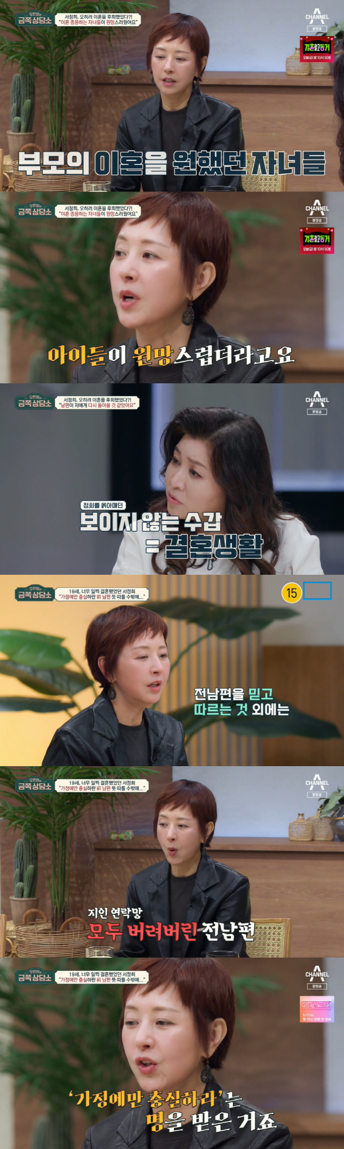 19세에 결혼한 서정희는 첫째 딸을 20세, 둘째 아들을 22세에 출산했다. 미국에 사는 친정 식구들과 떨어져 혼자 한국에서 지냈던 서정희는 "남편을 믿고 따르는 것 외에는 저는 길도 모른다. 전화번호가 적힌 수첩을 전 남편이 다 버렸다. 남편이 저를 위한다고 생각을 했다"면서 "'가정에만 충실하라'는 명을 받은거다. 그래서 모든 걸 남편 뜻대로 하기 위해 살았다"며 결혼 생활동안 모든 귀를 닫아버린 서정희였다.