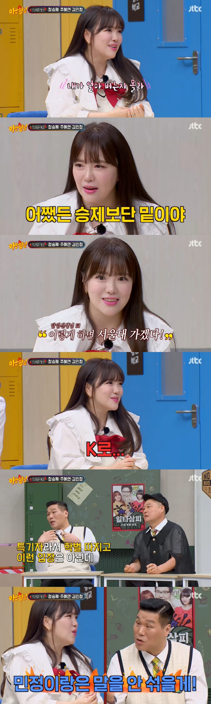 김민정은 연봉 질문에 "난 내가 얼마 버는지 모른다. 난 원래 학교 선생님이었다가 학원으로 옮겼는데 '두당 얼마'라는 말이 너무 충격적이었다. '학생 한 명당 얼마'라고 하는데 그 말이 너무 충격적이었다. 그래서 아이들을 어떻게 돈으로 볼 수 있냐고 해서 대판 싸웠다"고 말했다. 그러면서 "어쨌든 난 승제보다는 밑"이라고 덧붙였다.