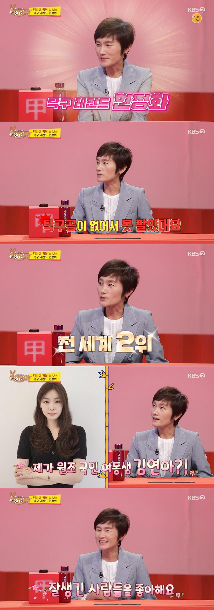 현정화의 당시 인기는 이 정도로 그치지 않았다. 현정화는 "미인 뽑기 대회에서 전 세계 2위했다"며 "한 인물 했던 거 같다 제가 원조 국민여동생 김연아?"라고 자화자찬했다. 이에 전현무는 "그런 건 저희가 할게요"라며 당황했다.