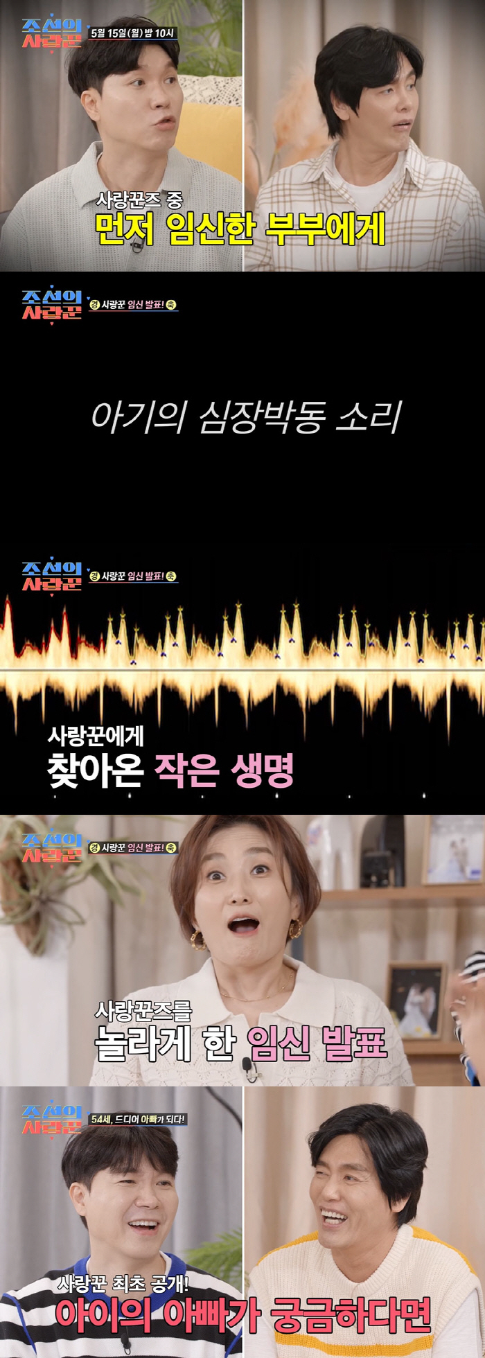 15일 방송될 TV CHOSUN 순도 100% 리얼 다큐예능 '조선의 사랑꾼'에서는 스튜디오에 출근한 '사랑꾼즈' MC들에게 세상에서 가장 행복한 소식이 전해진다. 바로 '사랑꾼즈' MC들 중 한 명이 2세의 심장 소리를 들려준 것이었다. "이 소리가 뭔지 맞혀 보라"며 들려준 태아의 심장 소리에 '사랑채' 스튜디오는 그야말로 발칵 뒤집혔고, 소름 돋는(?) 임신 풀 스토리에 '사랑꾼즈'들은 눈물까지 흘리며 축복을 쏟아냈다.