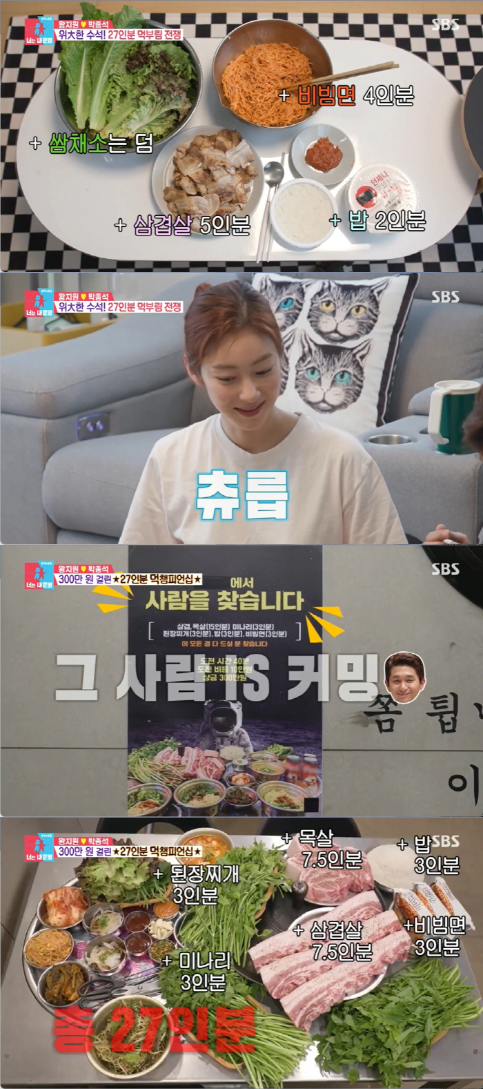 혼자서 비빔면 4인분을 먹겠다는 박종석은 거기에 냉동삼겹살 5인분으로 훈련하겠다며 요리하기 시작했다. 총 11인분을 앞에 둔 박종석은 맛있게 먹방을 시작해 흔적도 남기지 않고 싹 다 해치웠다. 하지만 챌린지는 27인분, 한참 먼 목표였다.
