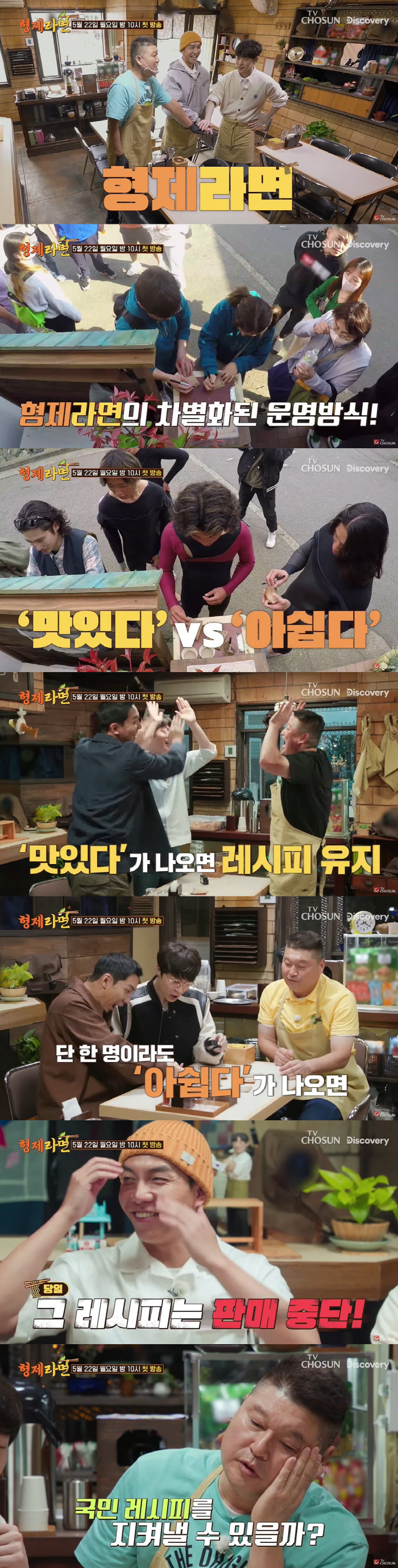 마지막으로 이승기가 "xx라면 날아갔다"라며 실망하자, 강호동 역시 "하나라도 지키면 다행이지"라고 근심 가득한 얼굴을 내비친 가운데 '국민 레시피를 지켜낼 수 있을까?'라는 문구가 새겨진다. '형제라면' 운영이 만만치 않은 고난을 예고하면서, 삼형제가 과연 국민 라면 레시피를 만들어낼 수 있을지 호기심을 증폭시킨다.