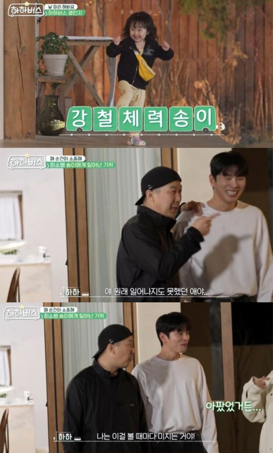 하하는 "그래서 볼 때마다 미치는 거야. 허리를 못 들었다니까. 이런게 나는 재밌지만"이라며 쉽게 말을 잇지 못했다. 그러자 이이경은 "뭉클할 때가 있구나"라며 아빠 하하의 마음을 읽었다.