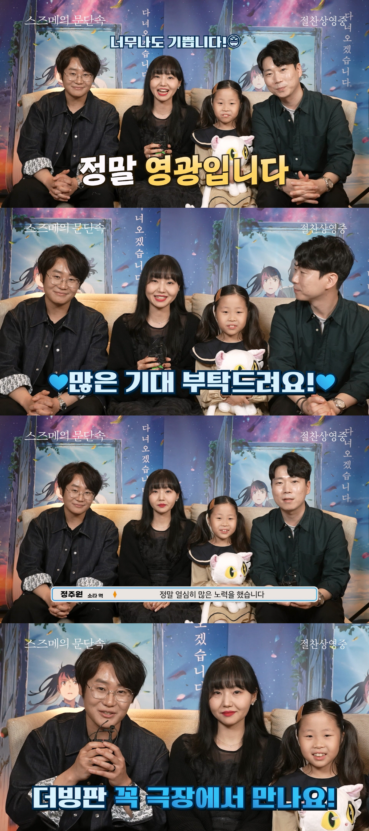 또한 이경태 성우와 이선율 성우도 각각 "여러분들이 많이 사랑을 보내주신 작품에 함께하게 되어 영광이다", "재미있게 연기했으니 많은 사랑 부탁드린다"며 한국어 더빙판에 대한 관객들의 성원을 부탁하는 소감을 전했다. '스즈메의 문단속' 한국어 더빙판은 개봉 확정과 함께 국내 최고 성우진들의 캐스팅 소식으로 화제 된 바 있다. 특히 소타 역의 정주원 성우가 소타가 문단속을 할 때 외치는 "돌려드리옵나이다!"를 짧게 재현하는 장면은 이들이 펼쳐낼 또 다른 매력을 가진 '스즈메의 문단속'을 기대하게 만든다.