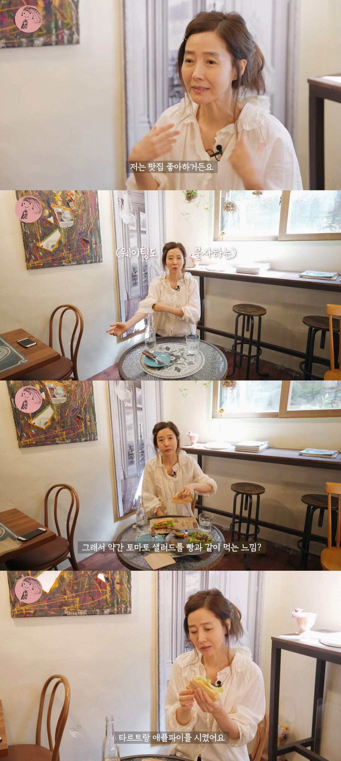 강수지는 주문한 음식이 나오자 맛에 감탄하며 "점심 한끼로 딱이다. 산책하고 먹으니까 더 좋다. 근데 남편은 한식을 좋아해서 '김치 없냐'고 물어볼 것 같다"라며 웃었다. 강수지는 이후 타르트와 애플 파이도 주문했다.