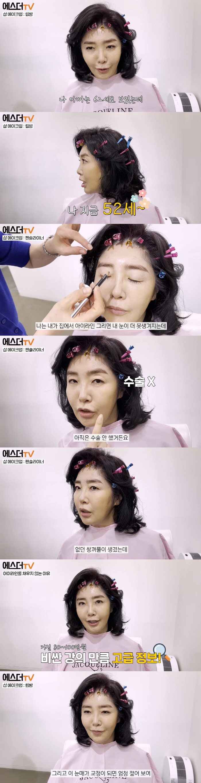 메이크업을 완성한 여에스더는 "여성들이 원하는 인상적인 눈매다. 이 눈매가 교정이 되면 엄청 젊어보인다. 아까는 62세로 보였는데 나 지금 52세"라면서 10년은 젊어진 메이크업에 환한 미소를 지었다.