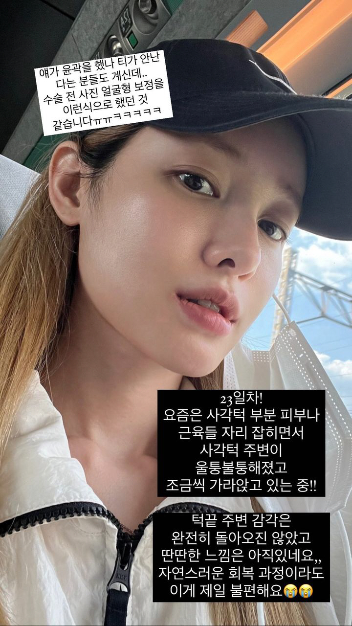 유깻잎은 19일 수술 23일차 상태를 공개했다. 유깻잎은 "요즘은 사각턱 부분 피부나 근육들 자리 잡히면서 사각턱 주변이 울퉁불퉁해졌고 조금씩 가라앉고 있는 중!! 턱 끝 주변 감각은 완전히 돌아오진 않았고 딴딴한 느낌은 아직 있네요..자연스러운 회복 과정이라도 이게 제일 불편해요"라고 토로했다.