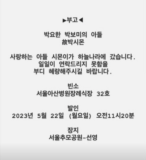 부고에는 "사랑하는 아들 시몬이가 하늘나라에 갔습니다. 일일이 연락드리지 못함을 부디 혜량해주시길 바랍니다"라고 적혀 있다.