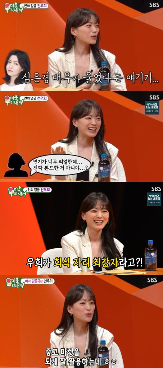 이날 MC 신동엽은 "영화 '써니'에서 배우 심은경씨가 진짜 무서웠다고 하던데?"라고 물었고, 천우희는 "안 그래도 울었다고 하더라. 그것까지는 못 봤는데 저보고 너무 (연기가) 리얼한데 진짜 본드한 거 아니냐, 라는 말도 들었다"라고 언급해 웃음을 자아냈다.