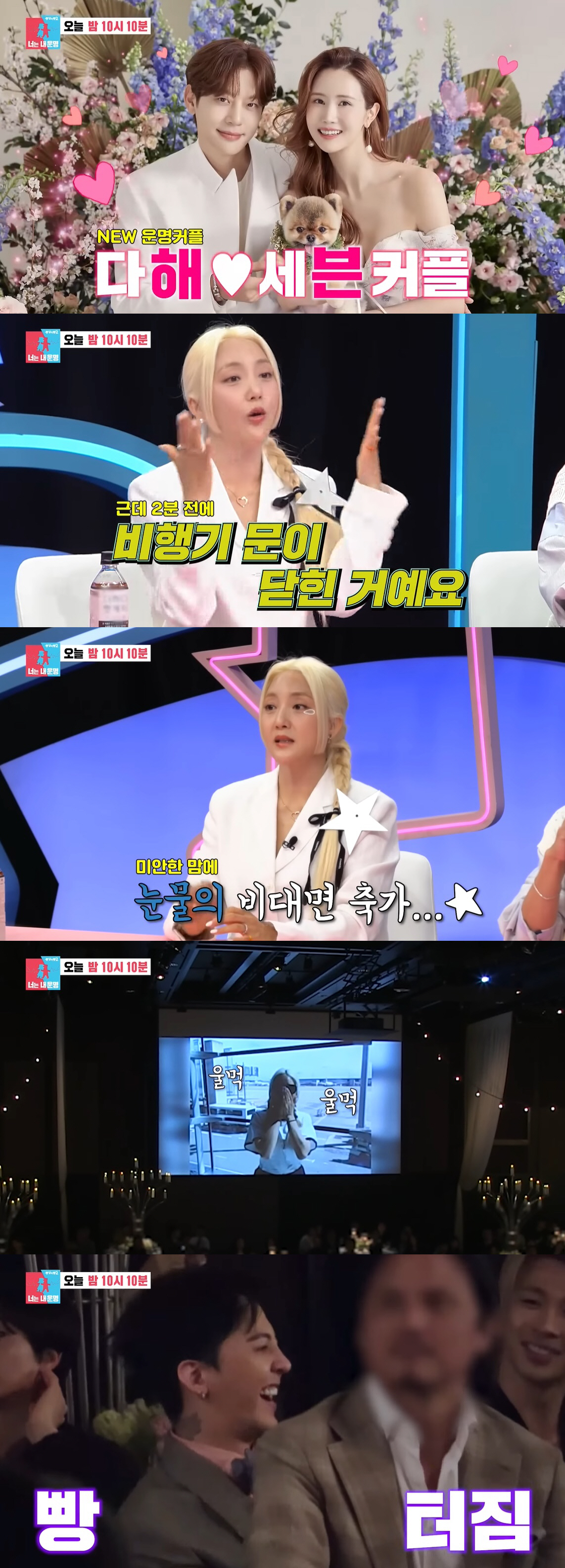 이어 바다가 결혼식장으로 보낸 영상이 공개됐는데 그는 "눈앞에서 비행기를 놓쳐서 너무 죄송하다"라며 울먹이며 축가를 불렀다. 하객으로 자리를 빛냈던 빅뱅 태양과 지드래곤, 차태현 등 스타들은 웃음이 빵터진 모습을 보였다.