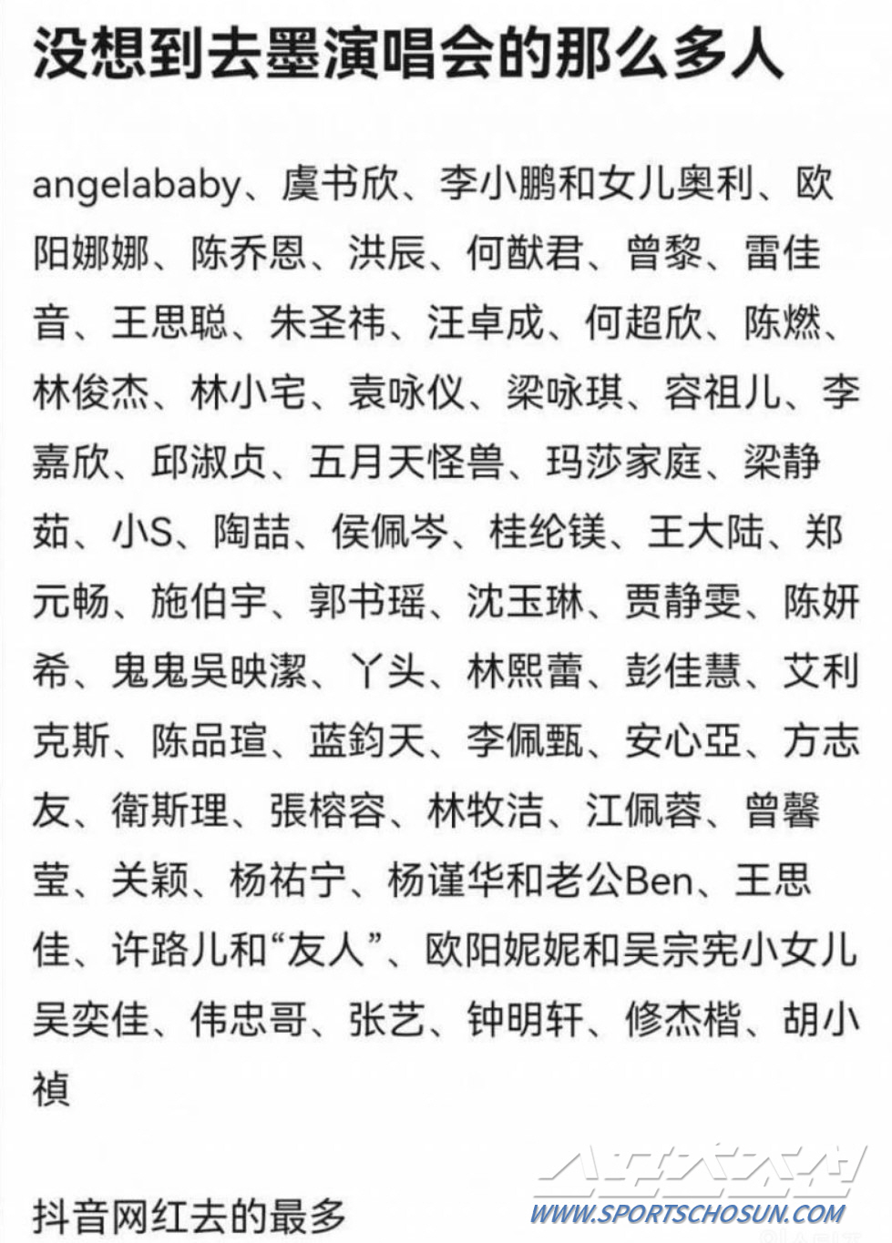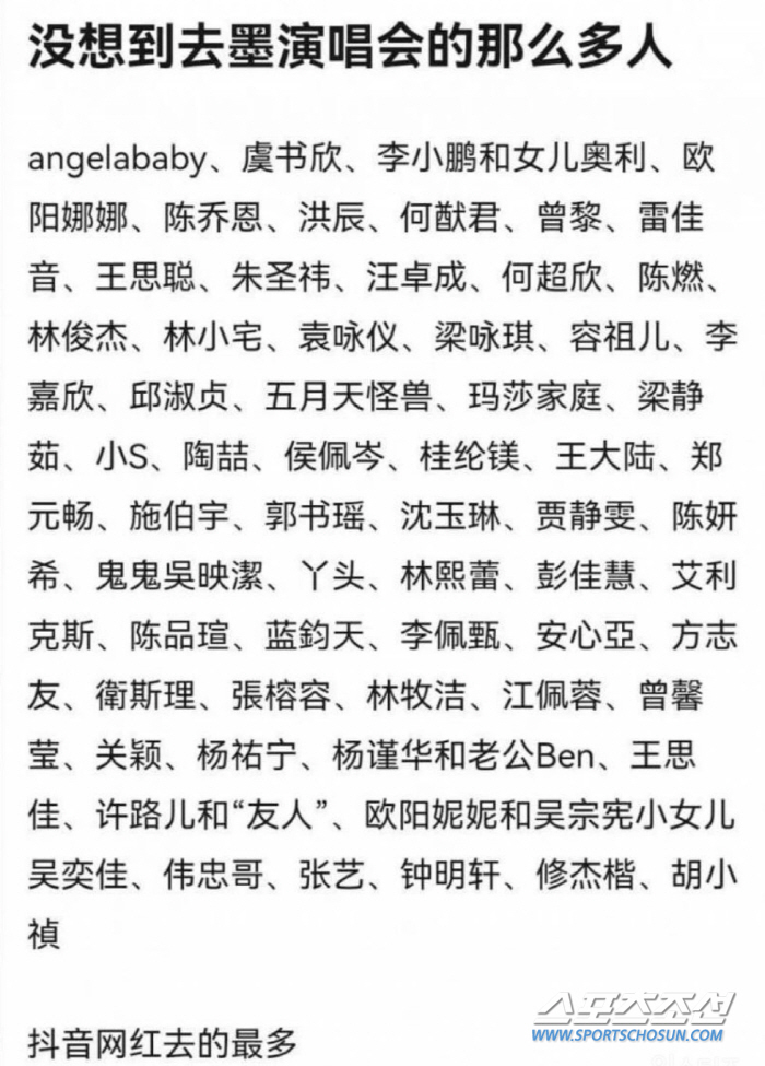 최근 중국 사회관계망서비스(SNS) 웨이보에는 블랙핑크 콘서트 현장을 찾은 중국 연예인, 인플루언서의 명단이 공개됐다.