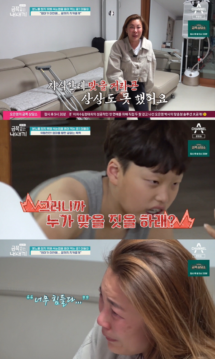 그러나 엄마는 아프지만 금쪽이를 위해 솔루션을 포기 하지 않았다. 이후 엄마는 제작진에게 "자식한테 맞을 거라곤 상상도 못했다. 무섭다. 폭력 수위가 너무 높다. 너무 힘들다"며 눈물을 흘렸다. 이어 "엄마가 진짜 미안하다. 엄마가 몰라서 그런 거니까 열심히 배워서 최선을 다할게. 엄마가 끝까지 지켜줄게. 사랑해"라며 힘든 순간에도 아들 생각 뿐이었다.