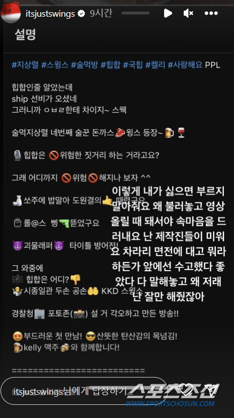 이에 스윙스는 "이렇게 내가 싫으면 부르지 말아줘요. 왜 불러놓고 영상 올릴 때 돼서야 속마음을 드러내요. 난 제작진들이 미워요"라며 "차라리 면전에 대고 뭐라하든가 앞에선 수고했다 좋았다 다 말해놓고 왜 저래. 난 잘만 해줬잖아"라고 황당해했다. 또 "도와줘도 왜 그래. 내가 뭘 그렇게 잘못했냐. 아니 '스윙스 불러놓고 개쪽주자' 이게 당신들 전략이야? 세상한테 당한 일로 생긴 불만 나한테 푸냐?"라며 "면전에 대고 말해 그럼 차라리 제작진 너희. 내 삶이 그렇게 별 거 없어 보여? 나 XX 공부해 나 XX 열심히 살아 나 내 예술에 진심이야 왜 네 수준의 해석으로 나를 끌어내리냐 내가 너네한테 뭐라 했냐고"라고 분노했다.