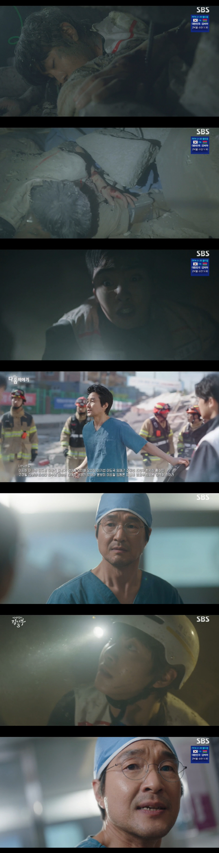 이에 서우진은 빠르게 상황을 파악에 나섰고, 이후 한 생명이라도 더 살리기 위해 최선을 다했지만 사망 환자가 발생했다. 그때 서우진은 건물 지하에서 생존자를 발견했다는 이야기를 들었다. 학원 선생님이 다리가 구조물에 끼어 움직일 수 없는 상황. 서우진은 "복부가 단단한 느낌으로 팽창됐다. 구조 작업까지 추가 붕괴 위험이 있어서 수작업으로 1시간 이상 거릴 것 같다"는 말에 응급처치를 위해 직접 지하로 내려가기로 결정했다. 박은탁은 "사고 현장에서는 의료진의 안전이 우선이다. 그게 원칙이다"고 했지만, 서우진은 "우리가 포기하는 순간 사람들이 죽는다. 아이들 구하겠다고 목숨까지 걸고 뛰어 내려간 선생님이다. 그런 분을 그냥 죽게 둘 순 없다"고 했다.