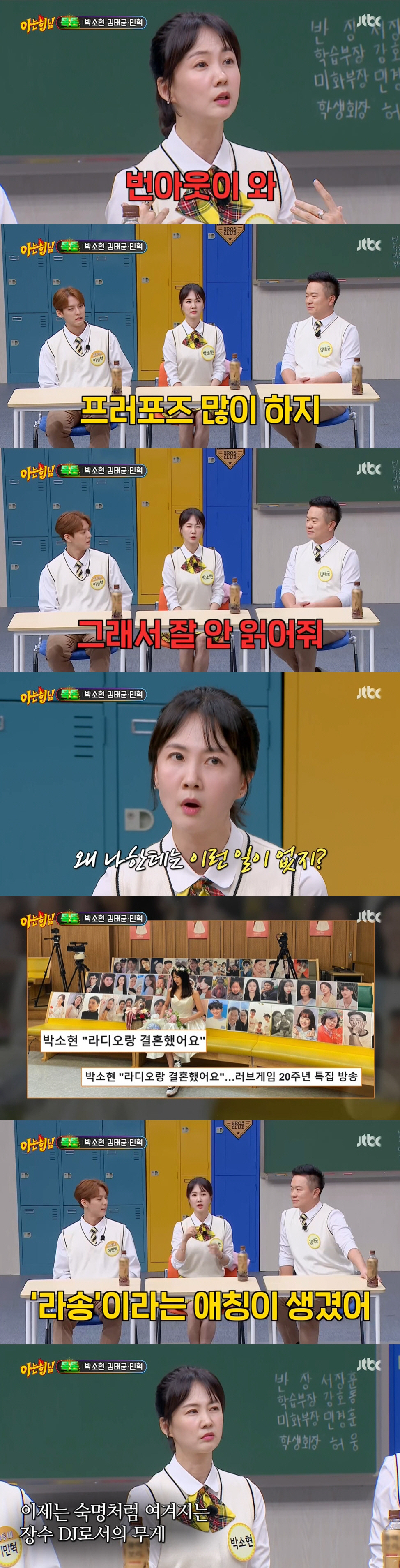 박소현은 "20년 동안 방송국에서 누군가를 만날 법도 한데 나한테는 이런 일이 없다"면서 "항상 이야기 할 때 '결혼하면 라디오 그만두겠다'고 합의 된 상태였는데 20년 동안 하게 됐다"고 했다. 이어 그는 "그러다 '라디오와 결혼 했어요'를 하게 됐다"면서 "정말 많은 번아웃이 오는데 20년을 하니까 '라송'이라는 애칭이 생겼다. '라디오계의 소나무'다. 그 애칭을 받으니까 '결혼을 해도 소나무처럼 한 결 같이 여기서 퇴근길 친구가 되어 주는 게 나의 존재 목적인가'는 생각이 들더라"고 했다.