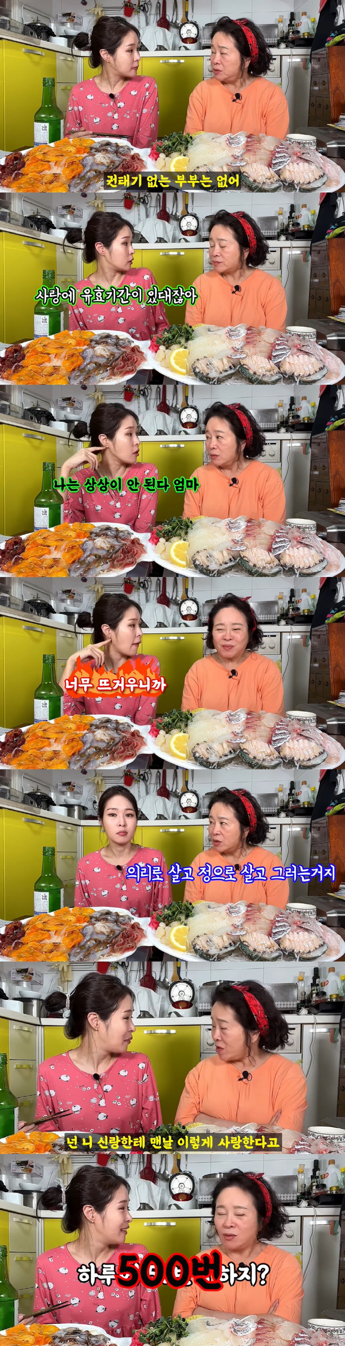 전성애는 "40대 초반이다. 갱년기인지 권태기인지 남편이 너무 꼴도 보기 싫고 같이 있는 게 싫다. 이 시기를 어떻게 극복하셨냐"는 질문에 "권태기 없는 부부는 없다"고 했다. 그러자 미자는 "나는 상상이 안된다. 너무 뜨거우니까"라면서 "사랑에 유효기간이 있다고 하지 않나. 그게 끝나면 어떻게 하냐, 나는 상상이 안 된다"며 웃었다. 이에 어머니는 "의리로 살고 정으로 살고 그러는거다"고 했다. 이어 전성애는 "부부 관계라는 건 참 묘하다. 사랑의 유효기간이 2년이라고 하면 2년이 지나면 정, 의리도 생겨서 더 큰 사랑, 그 사랑을 키워나가는 자세가 필요하다"고 했다.