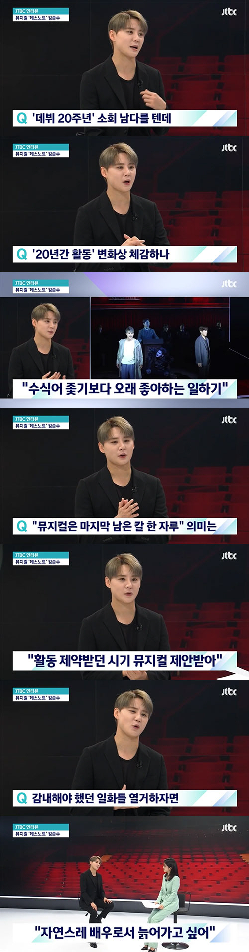 "뮤지컬 배우로서 또 앞으로 하고 싶은 목표는?"이라는 질문에 김준수는 "내가 하고 싶은 이 무대에 서면서 혹은 또 나이가 들어가면 또 들어감에 있어서 그 나이에 어울리는 배역들이 또 달라지잖아요. 그렇게 자연스럽게 배우로서 늙어 나가고 싶다. 그게 저의 정말 목표이자 바람인 것 같다"라고 목표를 전했다.