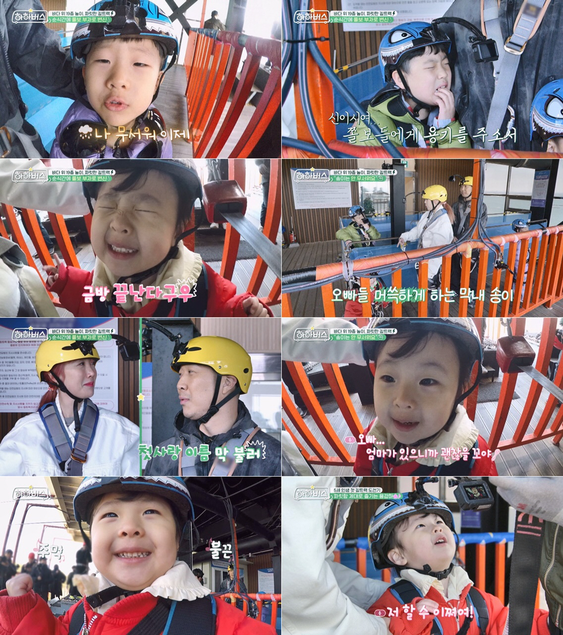 [스포츠조선 고재완 기자] '하하버스'의 막내 하송이 무려 아파트 19층 높이의 짚트랙 탑승에도 전혀 겁내지 않는 다섯 살 강심장으로 쫄보 오빠들을 호령한다.