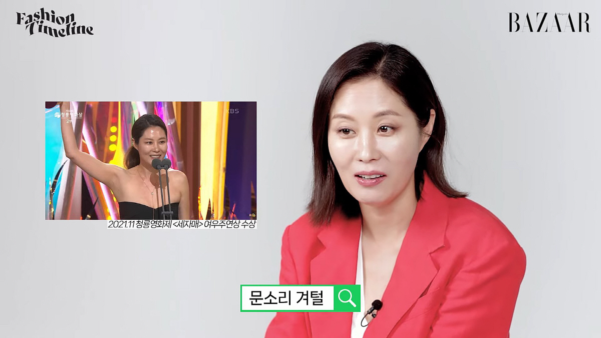 영상에서 2021년 청룡영화상 시상식 패션이 화두가 됐다. 문소리는 "원래 머리에 쓰는 것을 (몸에) 감아서 탑처럼 연출하는 아이디어가 돋보이는 룩이었다"라고 말했다.