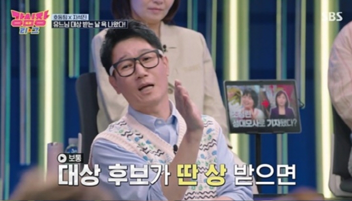 지석진은 "작년에 대상 여론들이 있지 않았냐. 나 아니면 탁재훈이라는 얘기가 있었다"라며 "시상식이 진행되면서 생각했던 후보들이 한 명씩 날아가더라. 나와 탁재훈, 신동엽이 남았는데, 대상 직전 PD상 수상자로 탁재훈이 호명됐다. 그때 손이 땀에 쫙 났다"고 전했다.