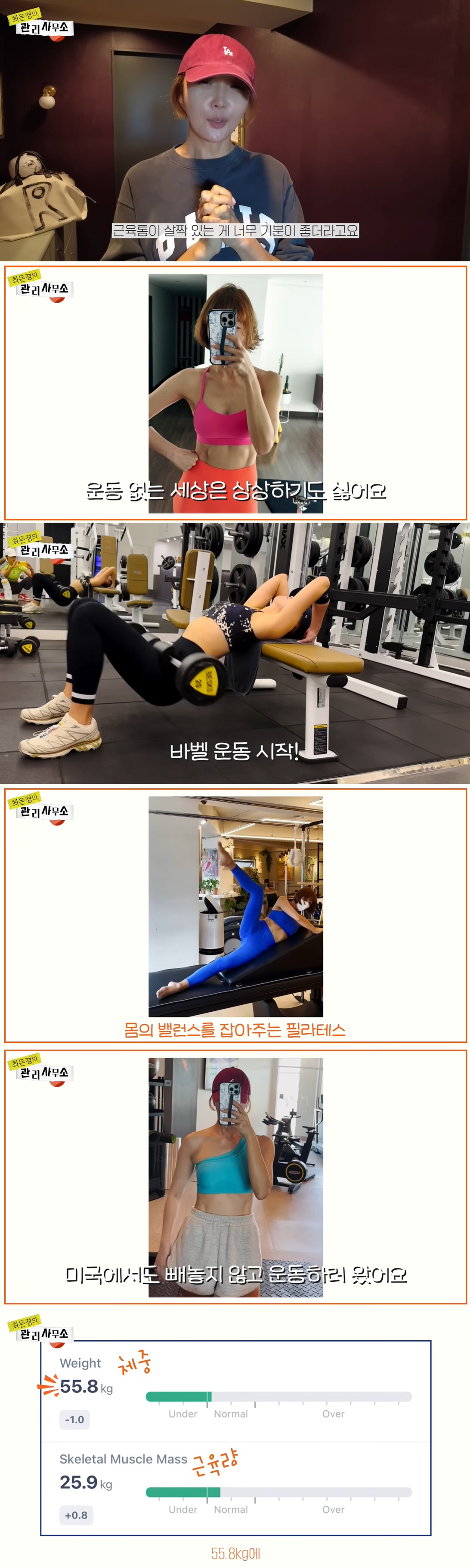 최은경은 "다리가 다쳐서 운동을 못한 지 한 달이 넘었다. 운동 욕구가 단전에서부터 올라와 있어 운동 루틴을 찍어보겠다"라고 알렸다. 최은경은 먼저 필라테스를 하며 땀을 흘렸다. 필라테스 아무리 바빠도 주 2~3회는 꾸준히 하고 있다고. 필라테스를 마친 후 최은경은 몸무게 55.8kg를 인증, "운동하니까 너무 좋다. 운동 없는 세상은 상상하기도 싫다"라고 말했다.