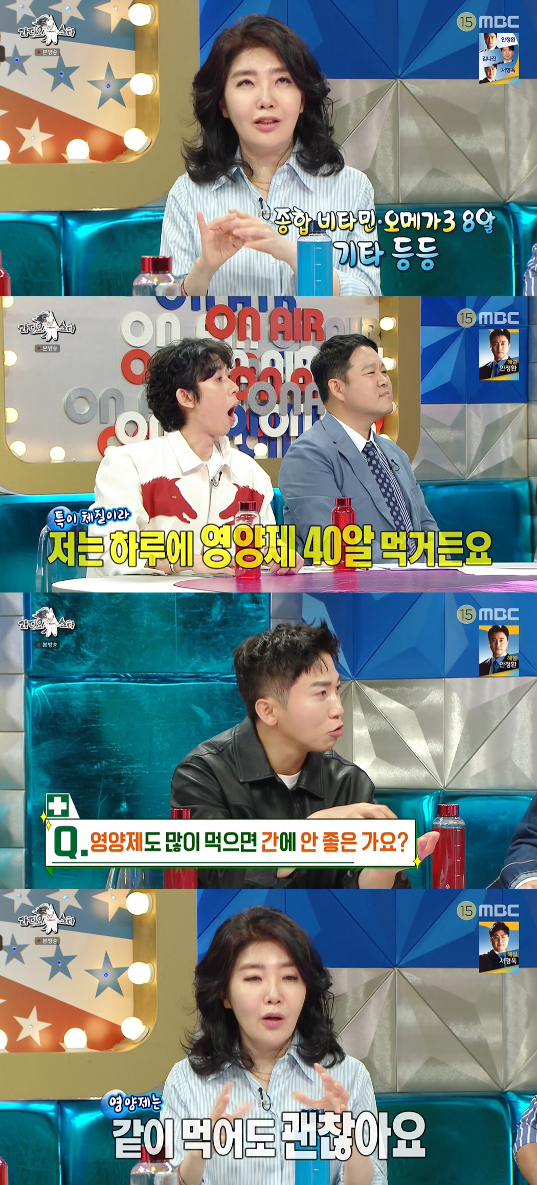 여에스더는 요즘 MZ세대가 영양제에 관심이 많다고 전하며 "영양제는 꼭 식사 후 먹을 필요가 없다. 칼슘 성분이 들어간 영양제가 아닌 이상 상관이 없다. 나머지는 한꺼번에 먹어도 된다"고 설명했다. 또 유세윤이 "영양제를 많이 먹으면 간에 안 좋지 않냐"고 궁금해하자 여에스더는 "저는 영양제를 40알씩 먹는다. 영양제는 같이 먹어도 괜찮다. 종합 비타민과 오메가3 등을 먹는다. 몸무게가 55kg인데 간에 아무런 문제가 없다"고 강조했다.