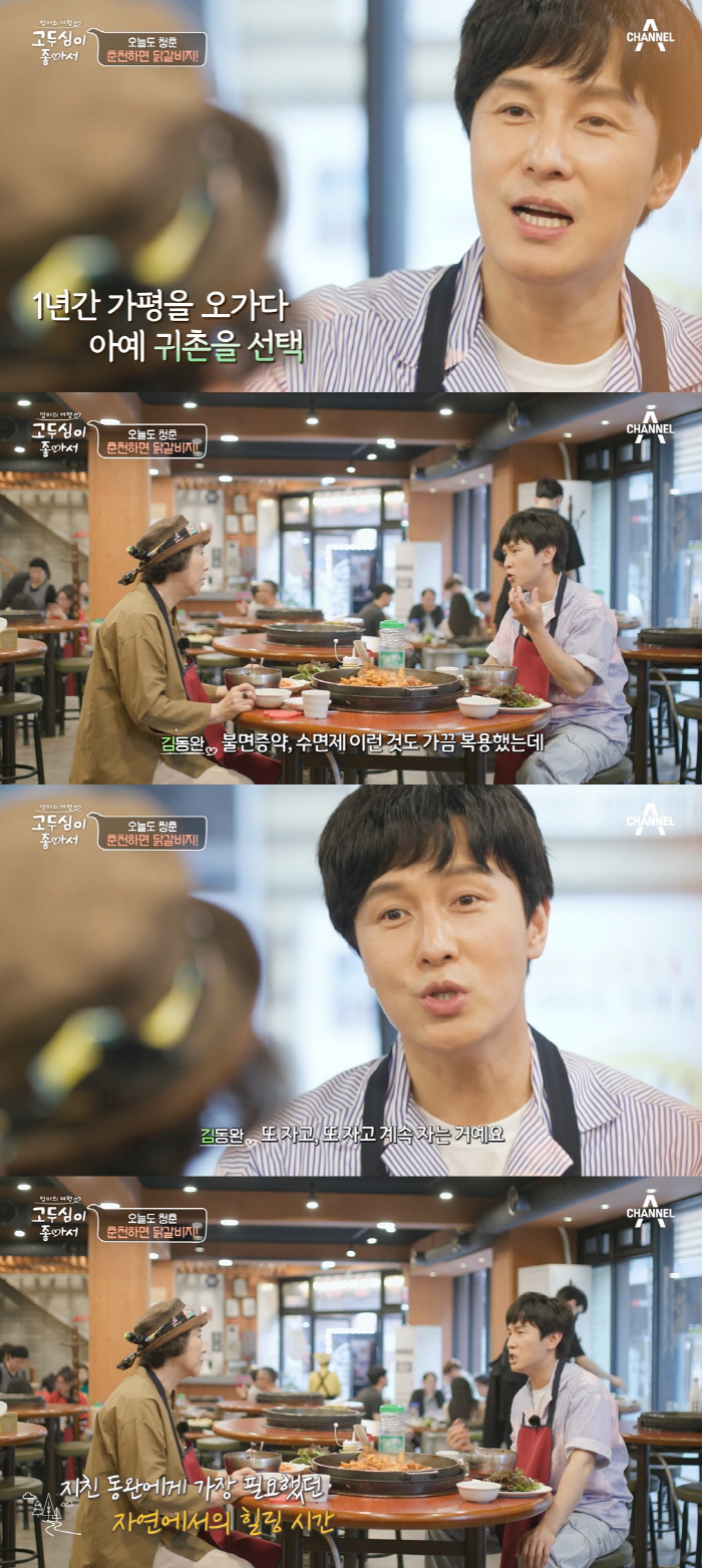 6년째 전원생활을 즐기고 있는 김동완은 "나이가 많지 않지만 가수 생활을 오래 하다 보니 지쳤다. 강박증과 불면증이 심하게 왔는데 지방에 가면 잠을 잘 자더라. 흙냄새를 맡고 새소리 들으면 그랬다. 1년 가평을 오가다가 귀촌하게 됐다"고 답했다.