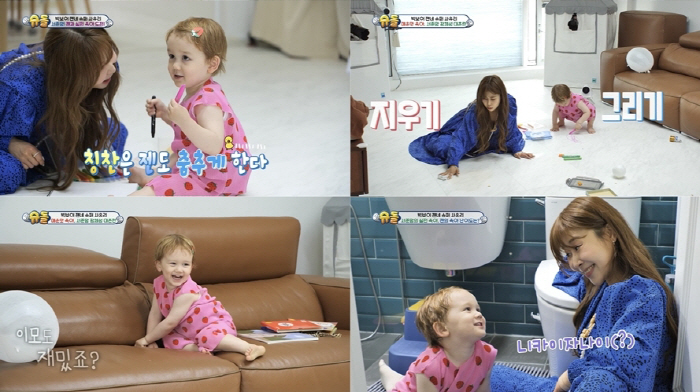 한편 젠은 '서준맘' 박세미를 만나 현실 육아의 매운맛을 선사했다. 엄마 사유리가 성대에 폴립이 생겨 제거 수술을 한 뒤, 말을 자제해야 하는 상황에 '서준맘' 박세미가 나섰다. 박세미는 부캐 '서준맘'으로 활약하고 있는 만큼 자칭 육아의 달인다운 자신만만함으로 젠의 육아에 뛰어들었다. 박세미는 젠을 만나자마자 친화력 최강자의 모습을 보였다. 젠은 박세미의 폭풍 칭찬에 처음 만났음에도 낯가림없는 천사같은 미소를 지어 귀여움을 선사했다. 박세미와 얌전히 그림을 그리던 젠은 귤을 온 거실 바닥에 던지며 장꾸미를 봉인 해제 했다. 박세미는 아이에게 한없이 다정한 부캐 '서준맘'에서 자신도 모르게 한숨을 쉬며 본캐 영혼을 소환해 폭소를 자아냈다. 하지만 젠은 다시 귤을 차곡차곡 스스로 정리해 박세미의 심장을 들었다 놨다 하는 밀당 매력으로 육아의 고됨과 기쁨을 전했다.