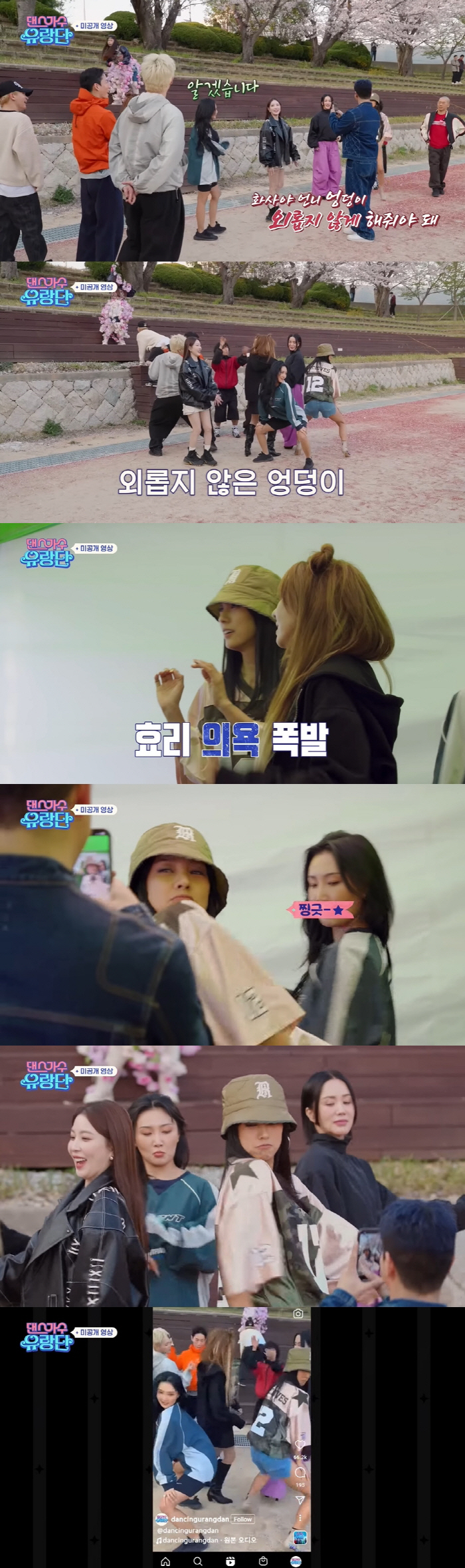 이날 유랑단이 도전할 릴스는 비트에 맞춰 어깨로 가볍게 리듬 타는 게 포인트. 영상 확인 후 유랑단은 잠시 연습 후 바로 실전 촬영을 진행했다. 막상 하려니 부끄러운 엄정화와 달리 이효리는 "화사야, 언니 엉덩이 외롭지 않게 해줘야한다"며 의욕을 폭발시켰다. 이후 이효리와 화사는 트월킹을 선보이며 유랑단의 첫 릴스가 완성됐다.